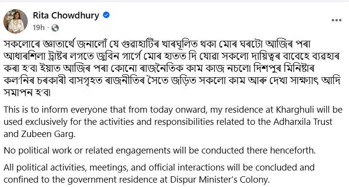 AssamRita Chowdhury Bars Political Meets at Kharghuli ResidenceRita Chowdhury has barred political meetings at her Kharghuli residence, stating it will now be used only for Adharxila Trust activities and cultural engagements.DY365 Feb 23, 2026 18:25 ISTRita ChowdhuryGuwahati: Renowned Assamese author and public figure Rita Chowdhury has formally drawn a line between her cultural commitments and political engagements, announcing that her private residence at Kharghuli will henceforth be reserved exclusively for activities linked to the Adharxila Trust and Zubeen Garg.AdvertismentIn a statement shared on social media, Chowdhury clarified that the Kharghuli residence will no longer host any political meetings, official discussions, or related engagements. Instead, all political work and administrative interactions will be conducted solely from her government-allotted residence at Dispur Minister’s Colony.“This is to inform everyone that from today onward, my residence at Kharghuli will be used exclusively for the activities and responsibilities related to the Adharxila Trust and Zubeen Garg. No political work or related engagements will be conducted there henceforth,” she wrote.She further specified that all political meetings and official interactions would be “concluded and confined” to her government residence in Dispur, effectively separating her cultural initiatives from her public responsibilities.AdvertismentALSO READ: “If She Didn’t Know Zubeen, Why Visit Now?” Assam CM Targets Priyanka Gandhi Over Zubeen Kshetra VisitAdvertismentAdvertisment Read the Next Article