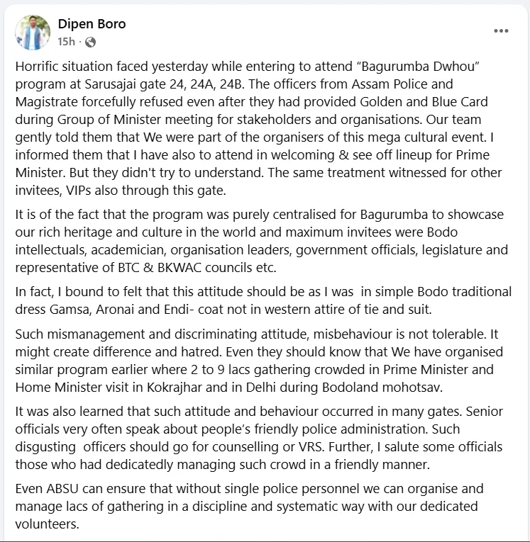 GuwahatiABSU Chief Alleges Discrimination at 'Bagurumba Dwhou' Event in SarusajaiABSU president Dipen Boro alleged mismanagement and discrimination by security at Sarusajai during the Bagurumba Dwhou event, claiming entry was denied due to his traditional attire.DY365 Jan 19, 2026 11:13 ISTGuwahati: All Bodo Students Union (ABSU) President Dipen Boro on Sunday night voiced displeasure over alleged mismanagement and discriminatory treatment by security personnel at Guwahati’s Sarusajai Stadium during the 'Bagurumba Dwhou' cultural programme.AdvertismentIn a detailed post on Facebook, Boro described facing a “horrific situation” while attempting to enter the venue through gates 24, 24A, and 24B. According to him, Assam Police and magistrate officials denied entry even after he presented the Golden and Blue Cards issued for the Group of Ministers’ meeting.Boro said he had informed officials that ABSU was one of the organisers of the event and that he needed to attend the welcoming and see-off programme for Prime Minister Narendra Modi. Despite this, he alleged that his request, along with those of other invitees and VIPs at the same gate, was ignored.Highlighting what he viewed as a cultural bias, Boro said the treatment may have been influenced by his attire. “I felt this attitude may be because I was wearing Gamusa, Aronai, and an Endi coat, instead of a western suit and tie,” he wrote, calling such behaviour “not tolerable” and warning that it could “create difference and hatred.”Boro stressed that ABSU has a proven track record of managing large-scale events, including those attended by the Prime Minister and Union Home Minister in Kokrajhar, as well as Bodoland Mohotsav in Delhi. He asserted that ABSU volunteers can maintain crowd discipline even without police deployment.While criticising some officials for their “disgusting behaviour,” Boro also acknowledged and praised others who managed the crowd professionally and courteously. He tagged senior authorities, including the Assam DGP and the Chief Minister’s Office, urging immediate attention to the matter.Despite the reported issues, the “Bagurumba Dwhou” programme concluded successfully, with over 10,000 performers showcasing the traditional Bodo dance in front of Prime Minister Modi. Chief Minister Himanta Biswa Sarma described the initiative as a platform to give Bagurumba international recognition, similar to the global exposure enjoyed by Bihu and Jhumoir, and to highlight Assam’s rich cultural heritage to a worldwide audience.ALSO READ: 10,000 Artistes, One Unforgettable Night: 'Bagurumba Dwhou' Lights Up SarusajaiAdvertismentAdvertisment Read the Next Article