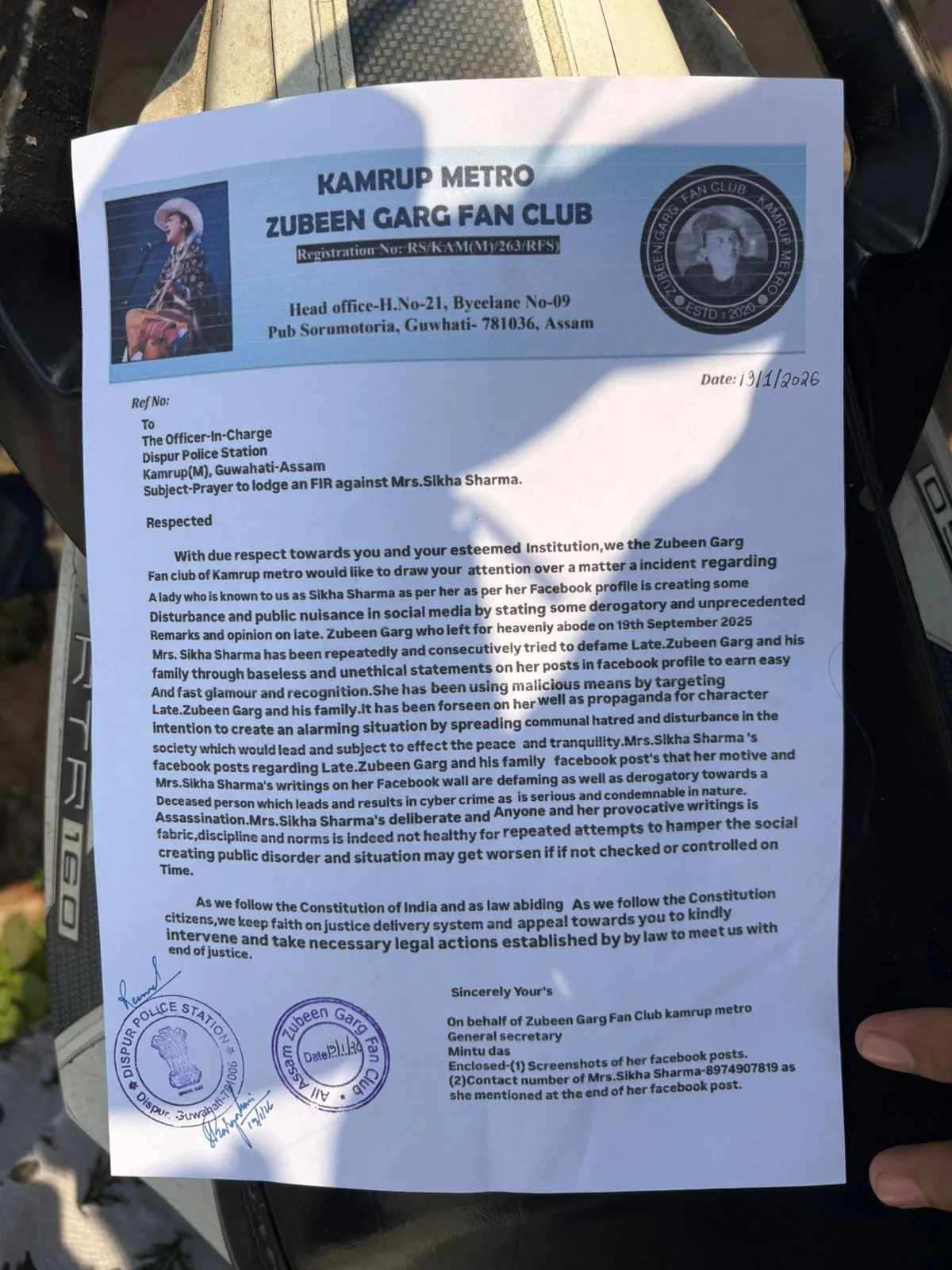 "Guwahati: Garima Saikia Garg, wife of the late music icon Zubeen Garg, approached the Assam Police Crime Branch on Monday morning to lodge a formal First Information Report (FIR) against writer Sikha Sarma over alleged derogatory remarks made on social media.Advertisment According to sources, the FIR has been filed in connection with a series of Facebook posts in which Sikha Sarma is accused of making objectionable and defamatory comments targeting the late singer. The posts allegedly included remarks questioning Zubeen Garg"s character, which, the complainants claim, have caused deep hurt to the family and his admirers. Notably, Today marks four months since the passing of Zubeen Garg. On the same day, Garima Saikia Garg approached the Crime Branch seeking legal action over what she described as repeated and offensive online statements directed at her late husband. Members of the Zubeen Garg Fan Club were also present at Dispur Police Station, where they submitted a complaint demanding strict action against Sikha Sarma. The fan club alleged that over the past several days, the writer had consistently posted inflammatory and disrespectful comments about the legendary musician on social media platforms. The complaints further state that such remarks not only defame the legacy of a revered cultural figure but also risk disturbing public harmony. Copies of the alleged social media posts have reportedly been submitted to the police as part of the complaint. Zubeen Garg, widely regarded as one of Assam"s most influential cultural icons, passed away on 19th September 2025, leaving behind a profound legacy in music and public life. ALSO READ: Garima Saikia Garg Rejects "Clean Chit" Narrative, Calls for Accountability of All Present on Yacht"
